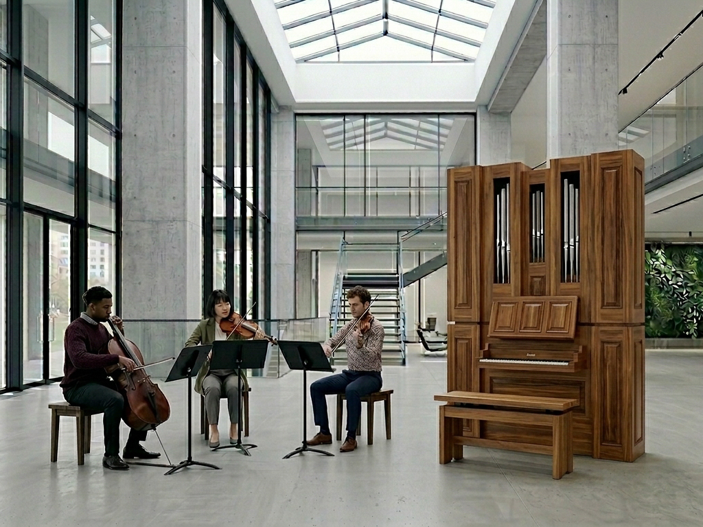 Google Gemini is a tool that uses emerging artificial intelligence technologies to help create. It can generate new images from prompts and uploaded images. I used Gemini here to place a design rendering of a 43-note alternative in a contemporary atrium space with three musicians to the left of the organ case.